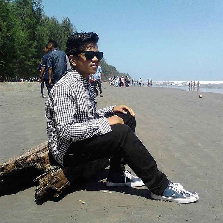 Pantai indah yang berpasir keabuan-abuan nampak begitu serasi dengan pepohonan cemara, kelapa serta rerumputan hijau yang terlihat begitu bersih. Hembusan angin dan hempasan air laut membuat suasana pantai ini begitu nyaman.