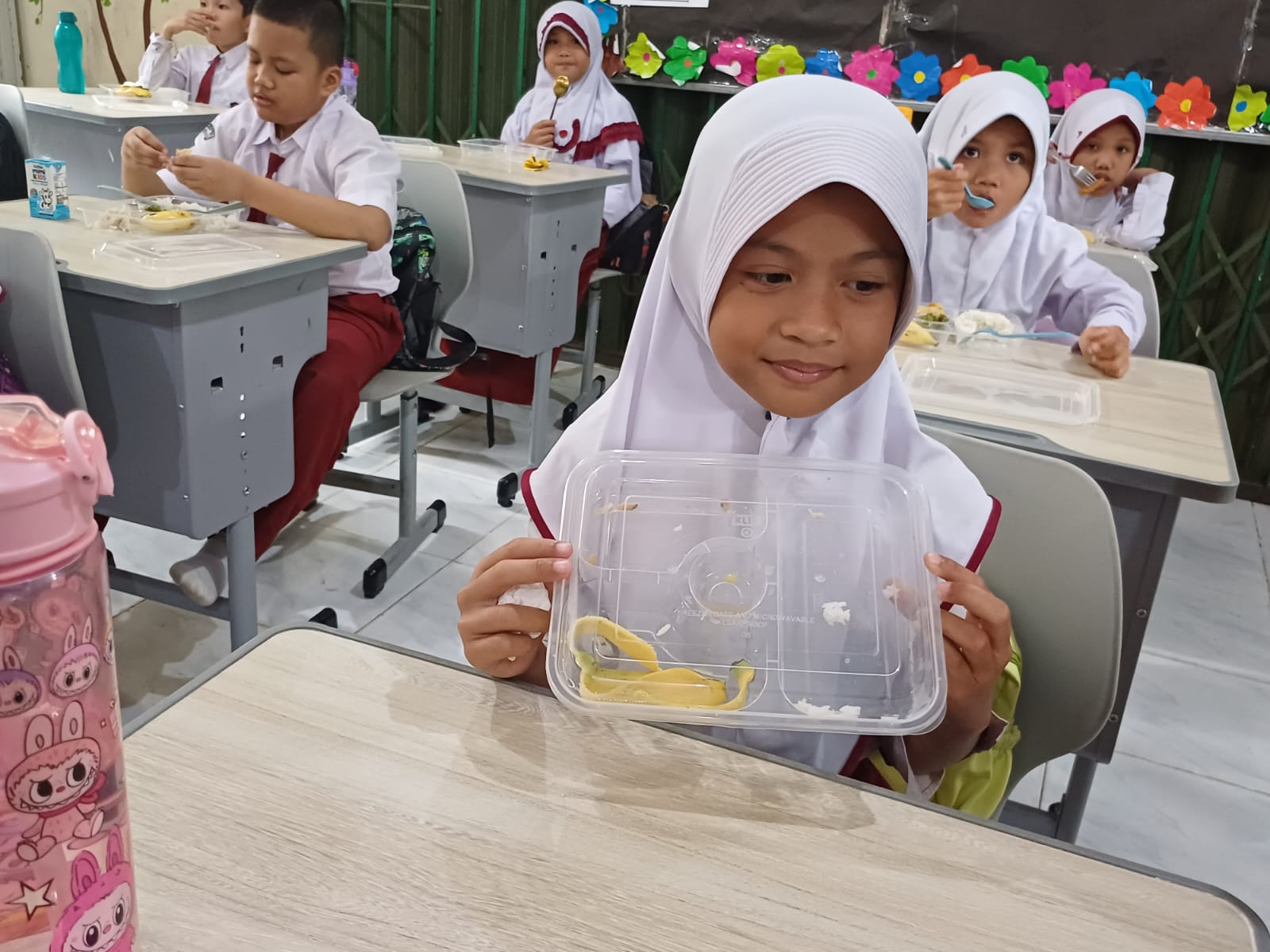 Siswa SD yang suka dan langsung menyantap makanan bergizi gratis ini yakni Queenza Elena (8 tahun), kelas 3. Queen mengaku suka dengan menu tahu dan tempe.