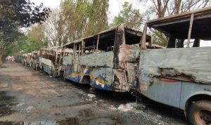 Terlihat setelah kejadian Mobil Transmusi berhenti di tengah jalan dengan keadaan motor berada di bawah mobil Transmusi tersebut.