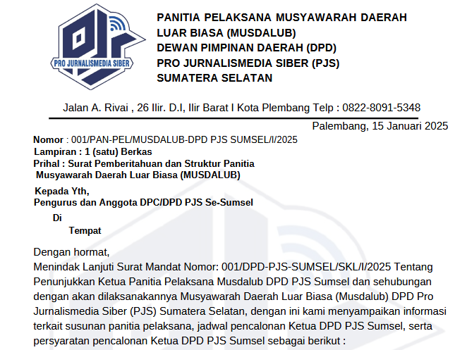 Palembang, Arungmedia.com—- Dewan Pengurus Daerah (DPD) Pro Jurnalismedia Siber (PJS) Sumatera Selatan akan segera menggelar Musyawarah Daerah Luar Biasa (Musdalub) pada tanggal 24 Februari 2025. Kegiatan ini bertujuan untuk memilih Ketua DPD PJS Sumsel yang baru guna menjalankan roda organisasi ke depan.