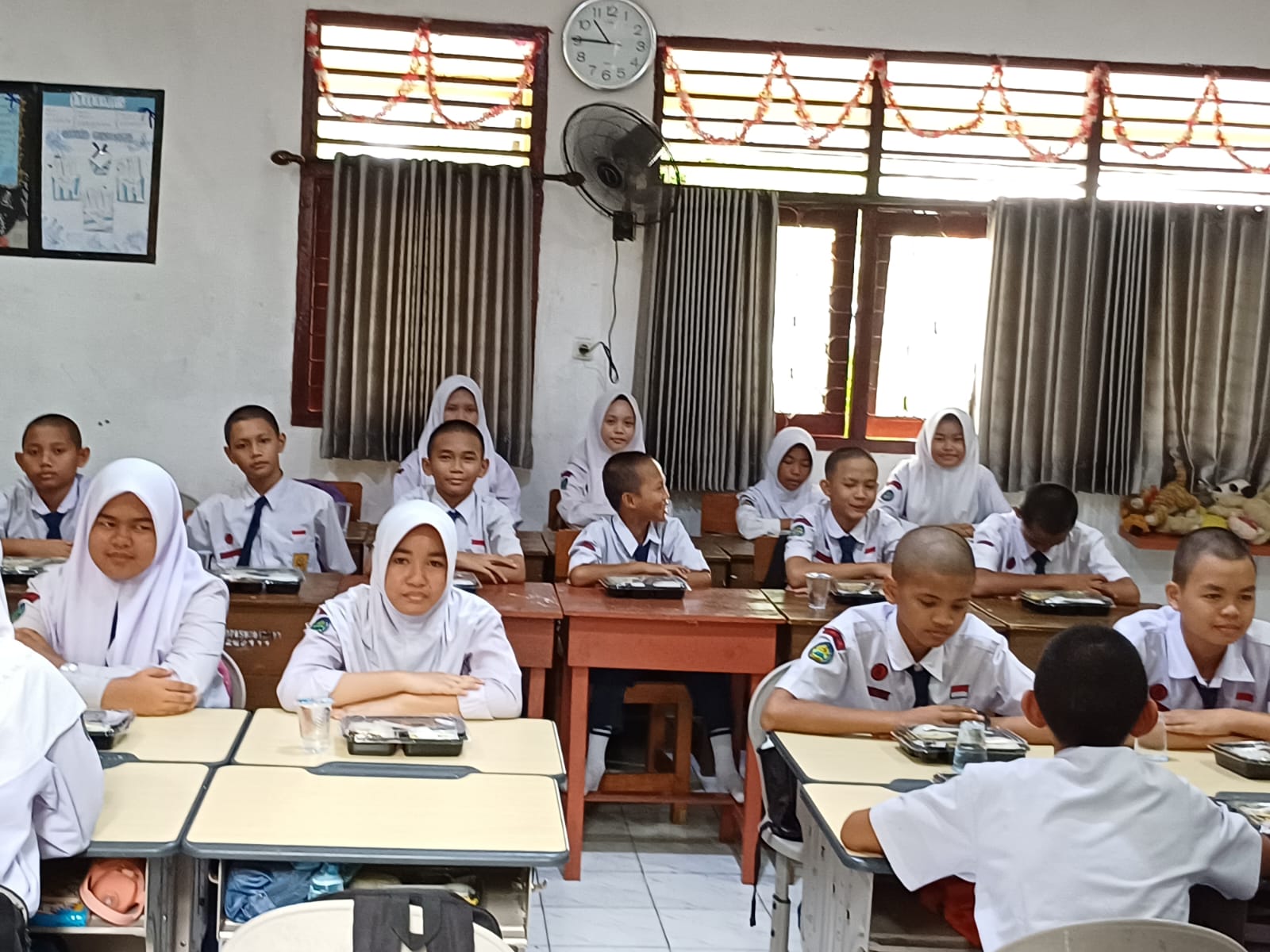 Tahap awal simulasi yang dilakukan di dua sekolah ini, makanan bergizi gratis diberikan untuk siswa kelas 7, 8 dan 9. Dengan isi menu makanan bergizi hari ini berupa nasi, ayam teriyaki, sayuran, buah, susu, dan air mineral.