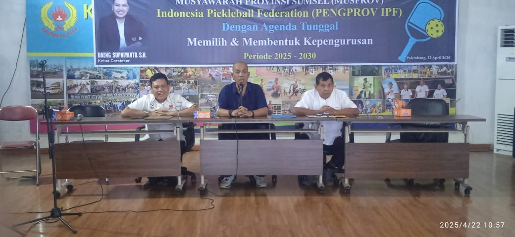 Palembang. Arungmedia.com—–Musyawarah Provinsi (Musprov) Indonesia Pickleball Federation (IPF) Sumatera Selatan (Sumsel) telah sukses digelar. Dalam pemilihan ketua umum periode 2025-2030, Bapak Daeng Supriyanto, SH, CMS.P terpilih secara aklamasi. Keputusan ini disambut antusias oleh seluruh peserta Musprov.
