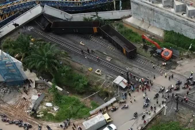 “Pengangkut girder untuk memindahkan dari sisi seberang jalan untuk dipindahkan ke seberangnya. Saat proses pemindahan, terjadi kemiringan pada girder dan tidak seimbang sehingga membuat alat pengangkut girder roboh lalu meminta kereta api Babaranjang yang lagi melintas dari palembang ke Muara Enim,” Bebernya.