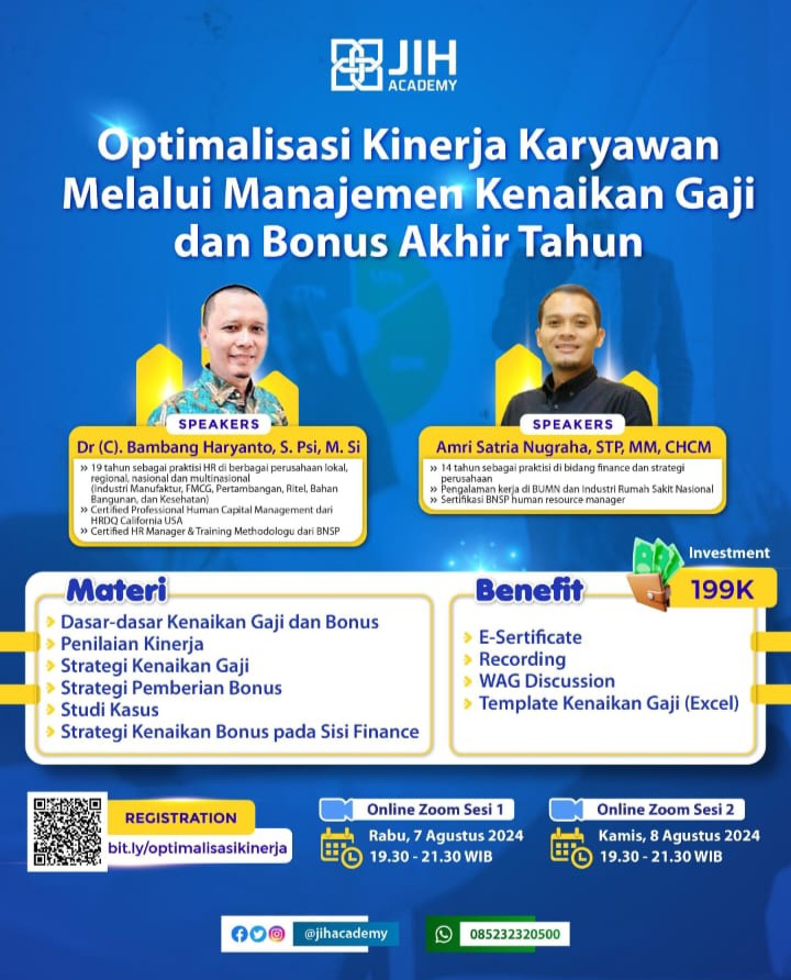 Mengangkat tema “Optimalisasi Kinerja Karyawan Melalui Manajemen Kenaikan Gaji dan Bonus Akhir Tahun” webinar dengan zoom meeting itu diselenggarakan selama dua hari, mulai dari hari Rabu dan Kamis, 7-8 Agustus 2024, pukul 19.30 WIB-21.30 WIB. Acara mendapatkan antusias dari para peserta yang terdiri dari dosen, praktisi organisasi/perusahaan dan umum.