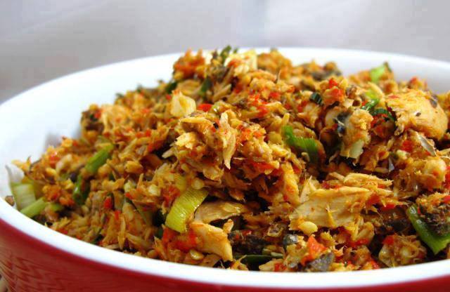Sebelum ikan cakalang yang sudah diasap ini dimasak, terlebih dahulu kita ambil dagingnya dengan cara disuwir-suwir lalu setelahnya digoreng.