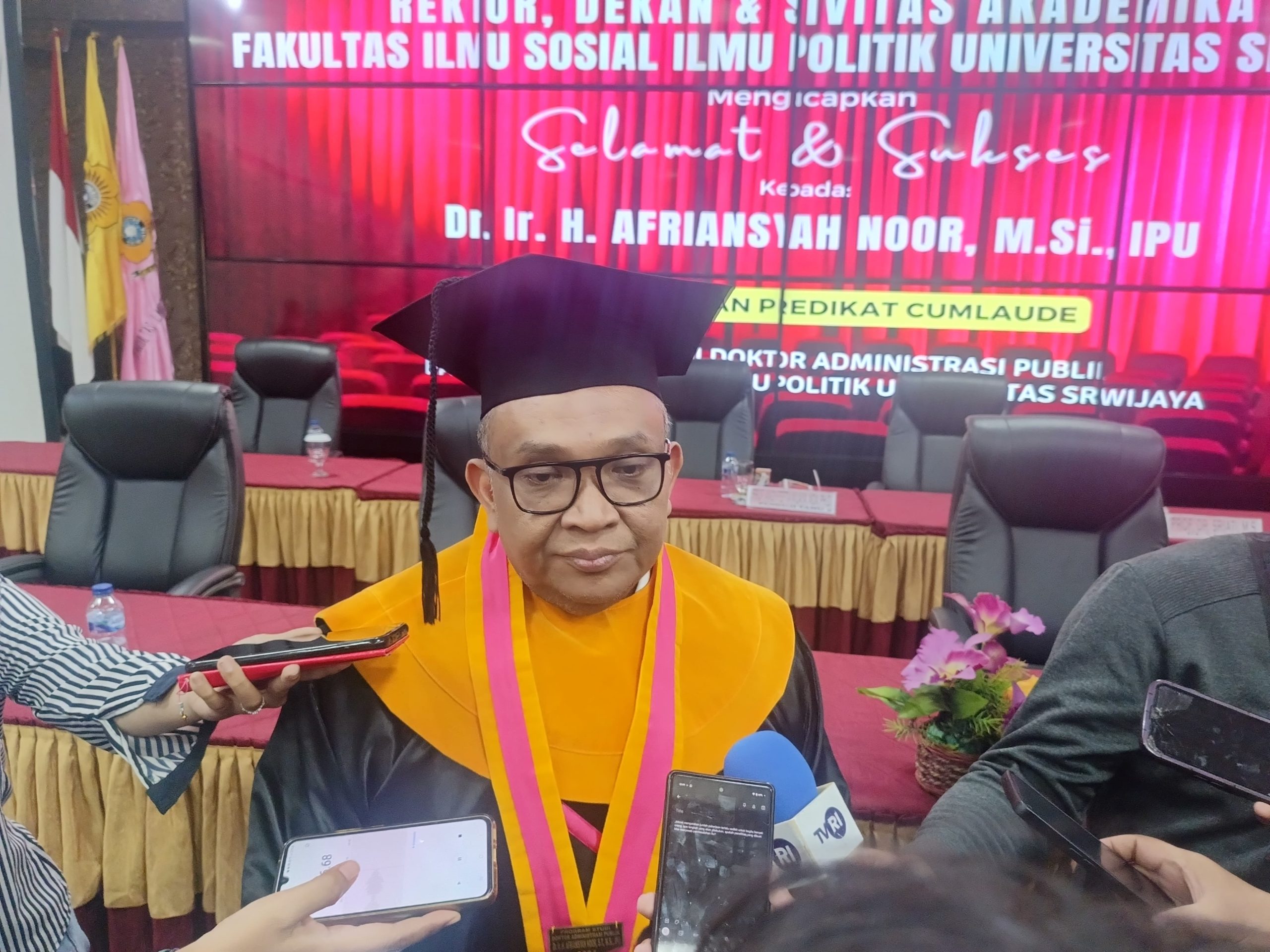 “Maka perlunya peningkatan SDM dengan pelatihan kemampuan, juga kerjasama dengan pemerintah,” katanya usai dirinya mengikuti Sidang Terbuka Promosi Doktor Fisip UNSRI, Sabtu (28/9/2024).