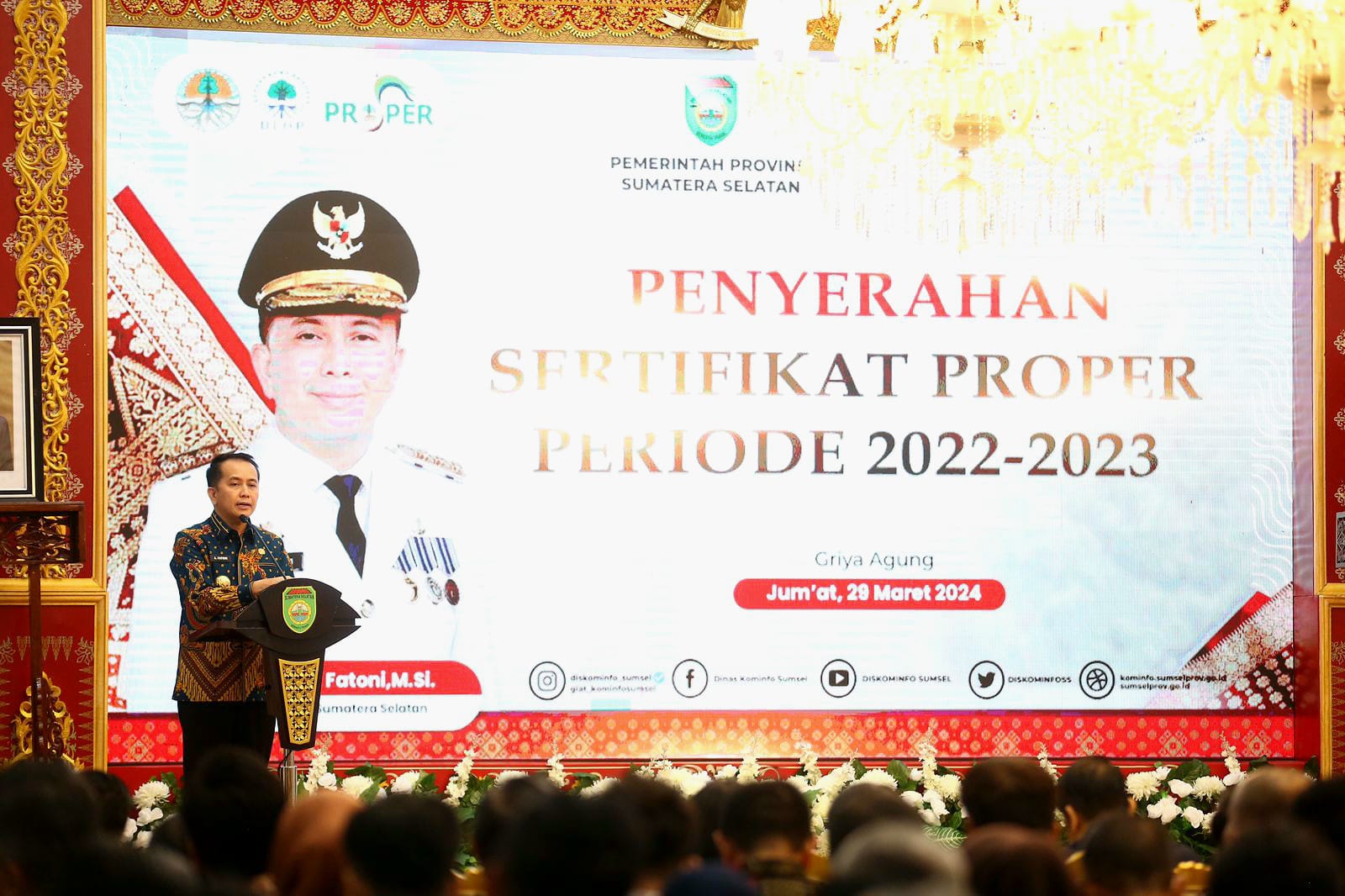 Palembang, (Arungmedia.com) — Penjabat (Pj) Gubernur Sumatera Selatan (Sumsel) Agus Fatoni menyerahkan sertifikat proper periode 2022-2023 untuk sejumlah BUMN dan Perusahaan Swasta Peduli Kelestarian Lingkungan. Kegiatan ini berlangsung di Griya Agung, Palembang, Sumatera Selatan, Jumat (29/3/2024).