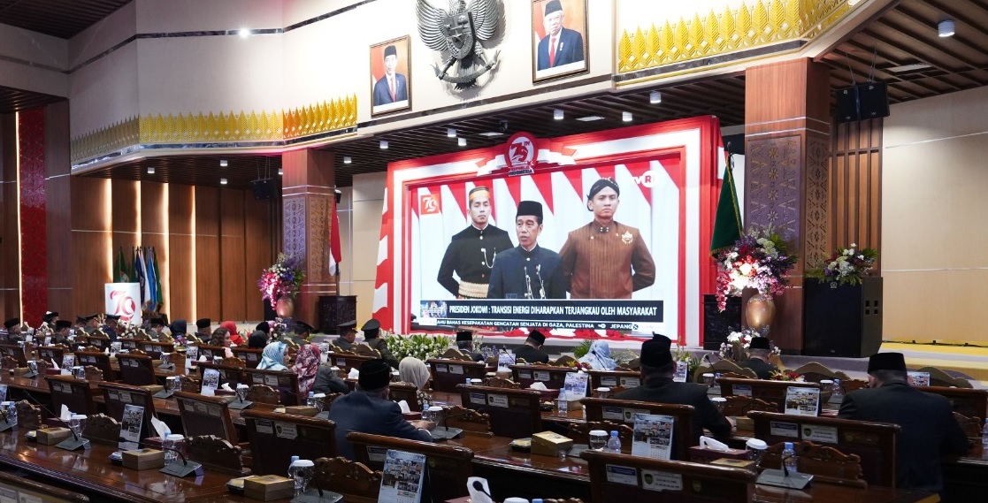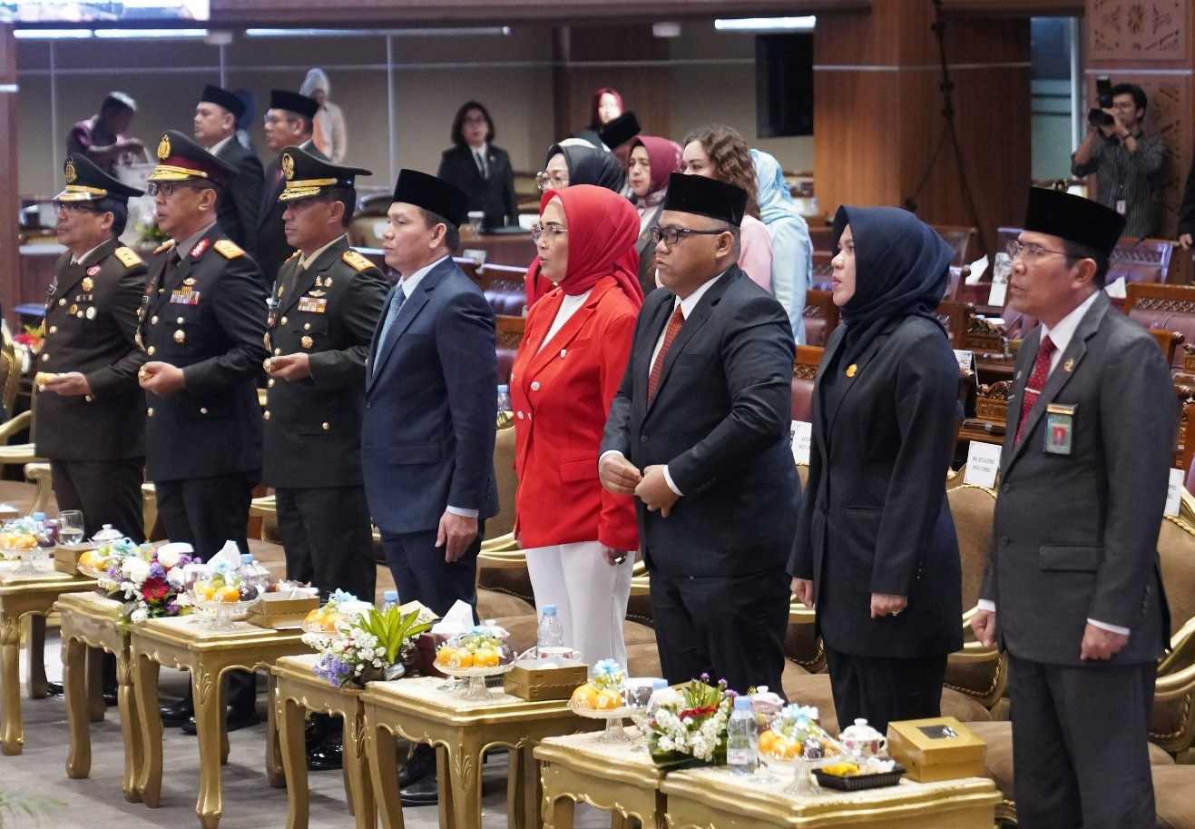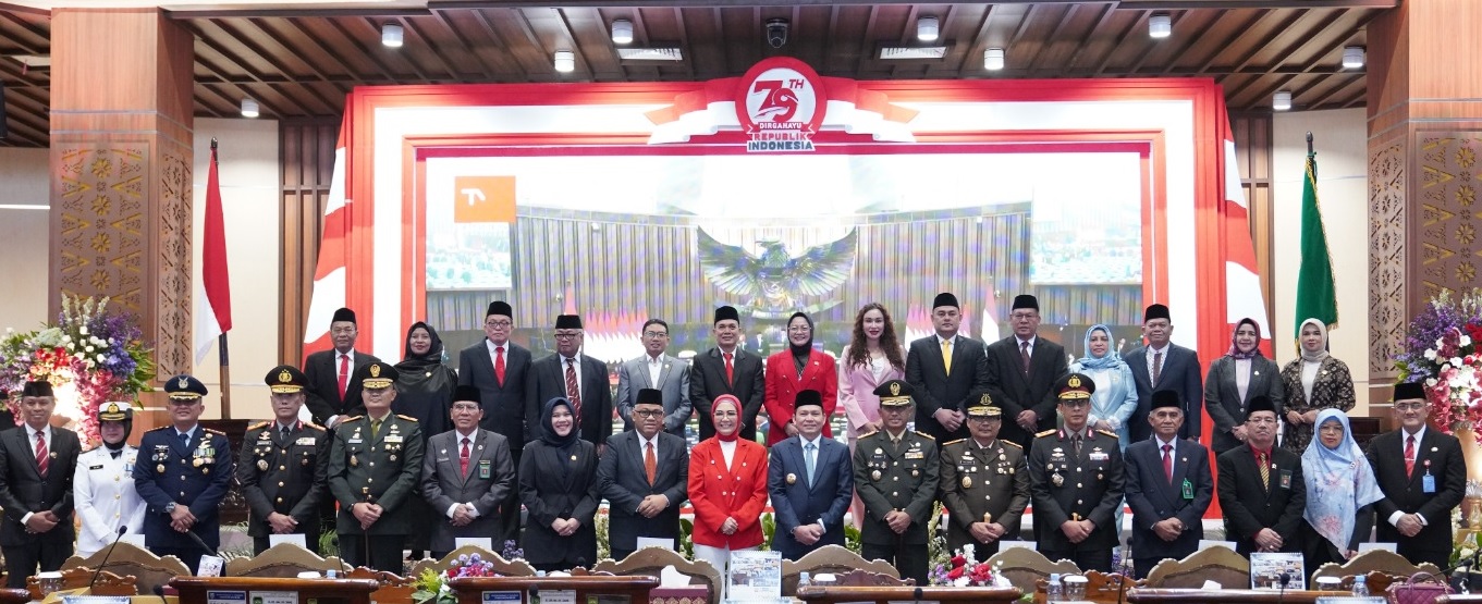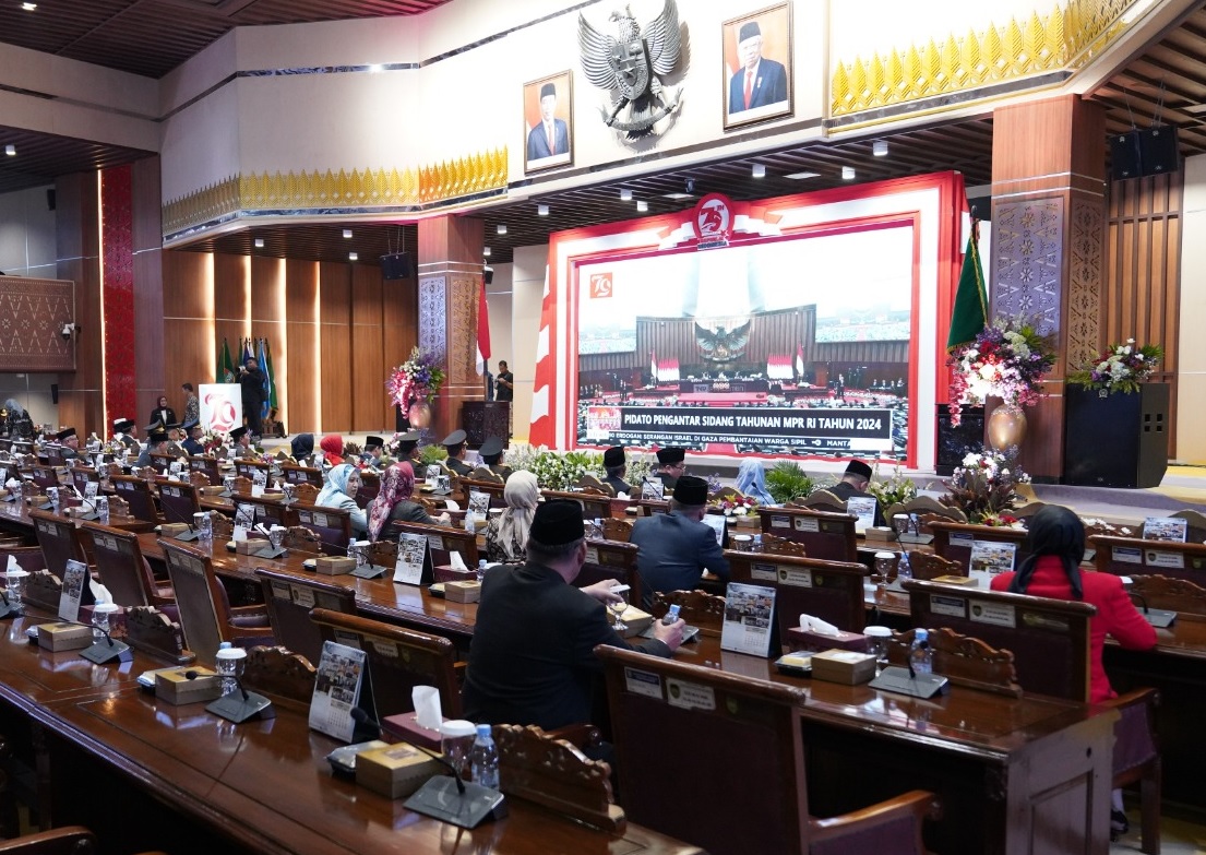DPRD Provinsi Sumsel menggelar rapat Paripurna Istimewa dengan agenda mendengarkan Pidato Kenegaraan oleh Presiden Republik Indonesia dalam rangka HUT Kemerdekaan RI ke-79 di Ruang Rapat Paripurna DPRD Provinsi Sumsel, Jum’at (16/8).Sidang Paripurna Istimewa ini dihadiri Ketua DPRD Sumsel Hj RA Anita Noeringhati didampingi jajaran Wakil Ketua DPRD Sumsel HM Giri Ramanda N Kiemas, Kartika Sandra Desi dan Muchendi Mahzareki. Paripurna tersebut dihadiri juga Pj Gubernur Sumsel Elen Setiadi dengan sejumlah Forkompinda dan para undangan dan anggota DPRD Sumsel.